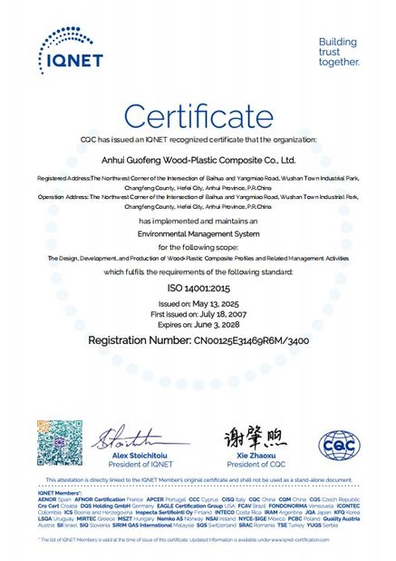মান:ISO9001 সংখ্যা:00122Q33631R5M/3400 প্রদানের তারিখ:2022-05-26 মেয়াদ শেষ হওয়ার তারিখ:2025-05-28 ব্যাপ্তি / বিন্যাস:Design,Development and production of wood plastic profiles প্রদান করেছেন:CQC |